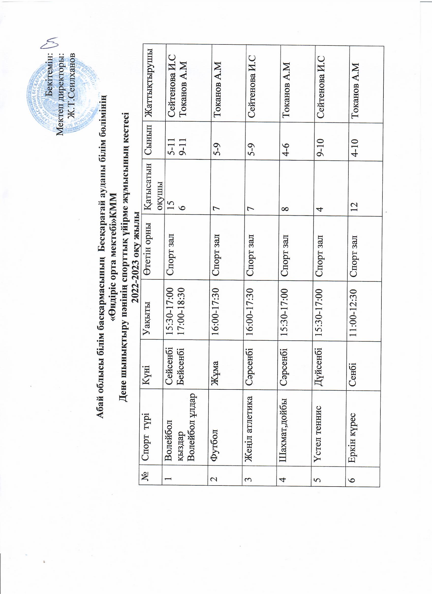01 сентябрь 2022 0 1 2 3 4 5 Денешынықтыру пәнінің 2022-2023 оқу жылына арналған спорттық үйірмелер жұмысының кестесі