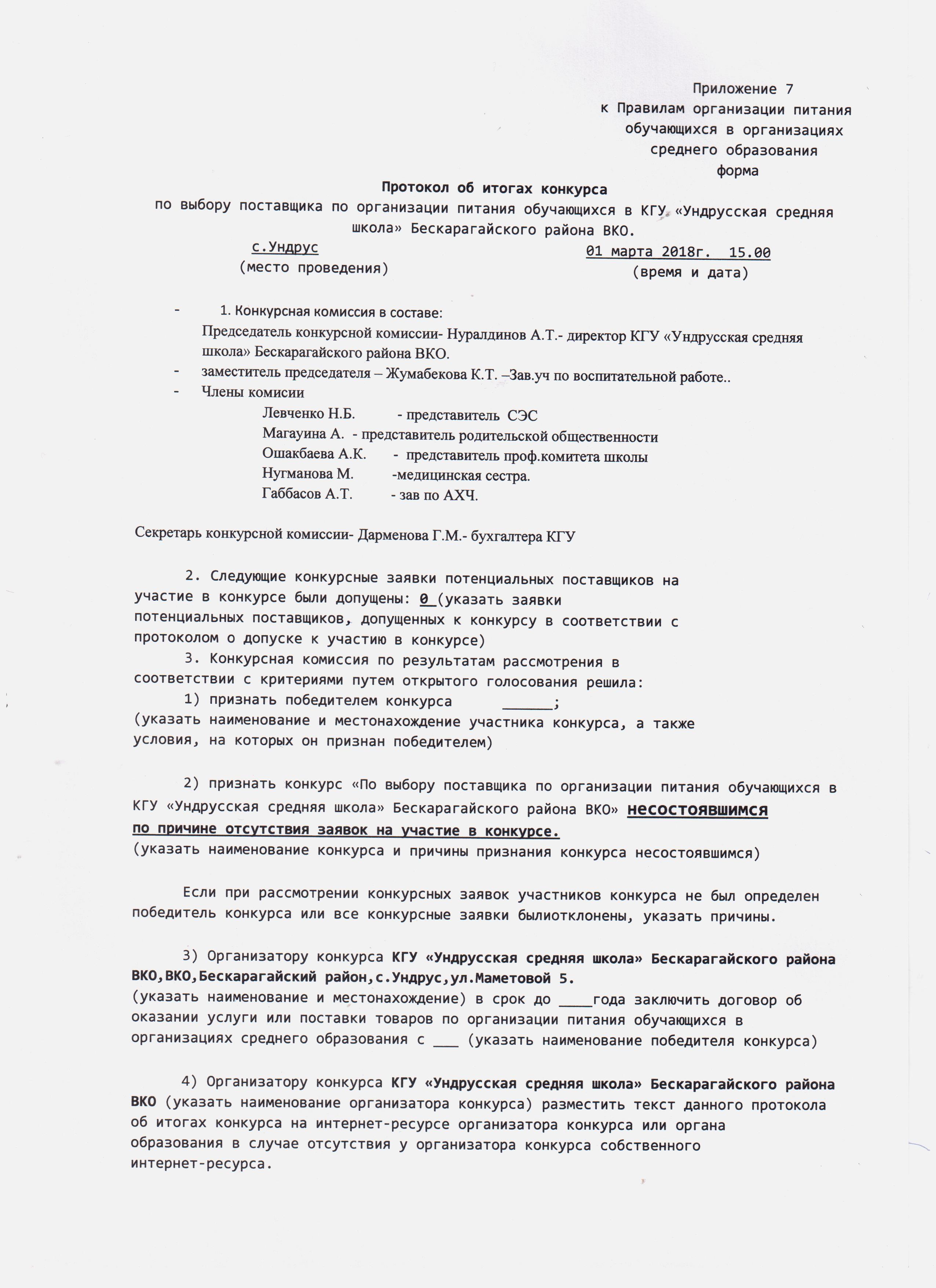 Конкурс по выбору поставщика по организации питания КГУ Ундрусская СШ