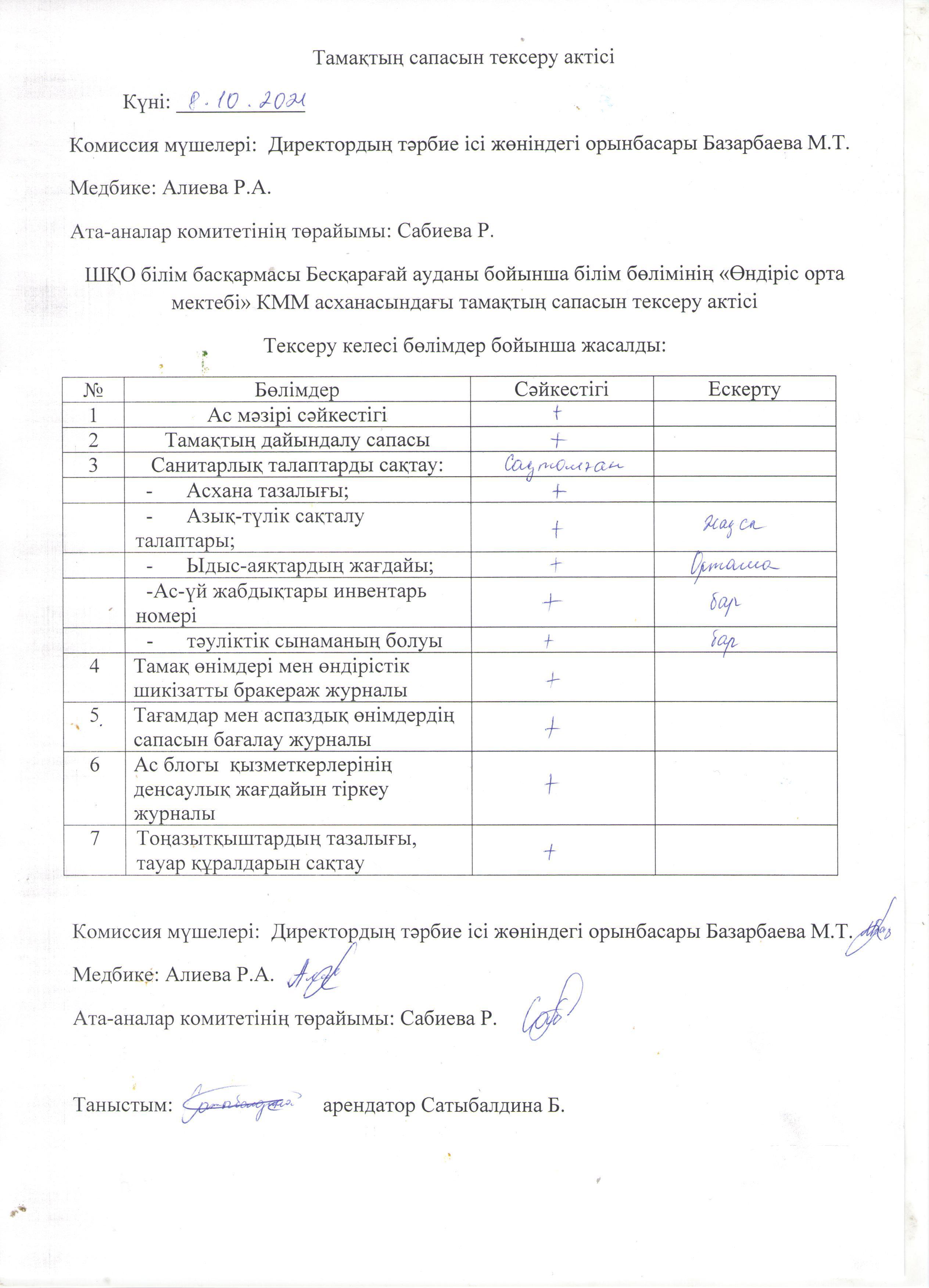 » » Тамақтың сапасын тексеру актсі