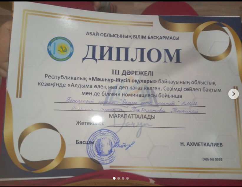 оқушысы Тоқболатова Толғанай III орын жүлдегері атанды. Жетекшісі: Кабзулдина Нұргүл Жұмагелдіқызы