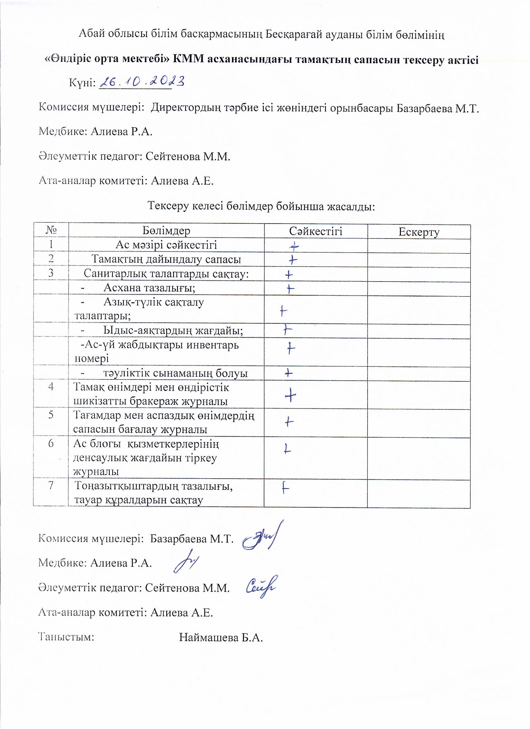 Тамақтың сапасын тексеру актісі » Өндіріс ОМ